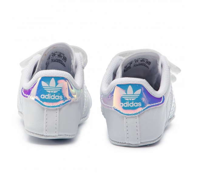 Tige en mesh. Renfort en caoutchouc à l’avant-pied. 3 bandes en cuir. Fermetures auto-agrippantes confortables pour enfiler et retirer facilement la chaussure. Alliant amorti et légèreté, la semelle de propreté OrthoLite® est traitée pour limiter le développement des odeurs. Impression métallisée "SUPERSTAR" sur du mesh. Logo Trèfle imprimé sur le patch au talon. Semelle extérieure en toile avec motif caoutchouc imprimé. Chaussures nouveau né