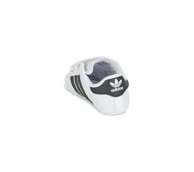 Tige en mesh. Renfort en caoutchouc à l’avant-pied. 3 bandes en cuir. Fermetures auto-agrippantes confortables pour enfiler et retirer facilement la chaussure. Alliant amorti et légèreté, la semelle de propreté OrthoLite® est traitée pour limiter le développement des odeurs. Impression métallisée "SUPERSTAR" sur du mesh. Logo Trèfle imprimé sur le patch au talon. Semelle extérieure en toile avec motif caoutchouc imprimé. Chaussures nouveau né