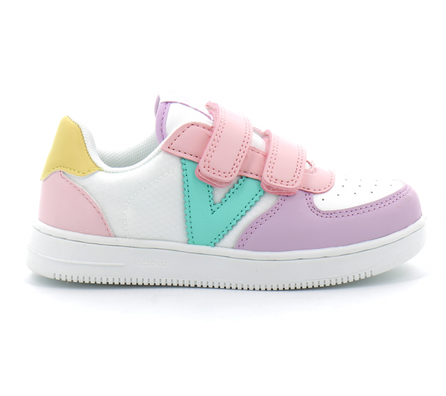 Baskets de sport pour enfant fabriquées dans une matière effet cuir et pièces multicolores superposées. Finition brillante texturée sur les côtés et V rétro de victoria en contraste. Fermeture à deux scratchs (trois à partir de la pointure 36) qui facilite le chaussage et permet un ajustement parfait. Avec empeigne perforée pour une meilleure aération.