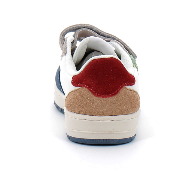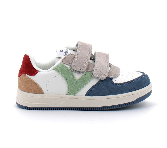 Baskets multicolores pour enfant fabriquées dans une matière effet cuir et pièces de cuir fendu superposées. V rétro de victoria sur le côté intérieur et étiquette sur la languette. Fermeture à deux scratchs (trois à partir de la pointure 36) qui facilite le chaussage et permet un ajustement parfait. Semelle bicolore et empeigne perforée pour une meilleure aération.