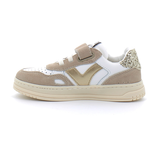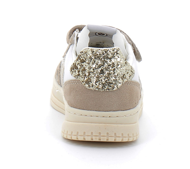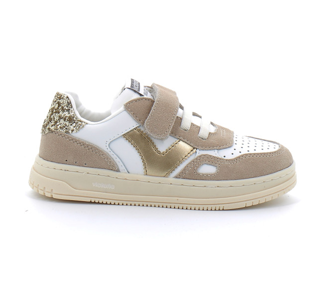 Baskets pour fille fabriquées dans une matière effet cuir de qualité supérieure avec des pièces en cuir fendu. V de victoria métallisé et détail en forme de fenêtre sur le côté. Détail glitter texturé sur l'arrière et semelle légèrement fauve. Fermeture à lacets élastiques et scratch qui facilite le chaussage et encourage l'autonomie. Elles disposent d'une semelle intérieure matelassée supplémentaire pour un plus grand confort.
