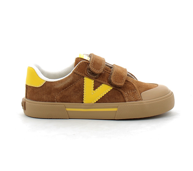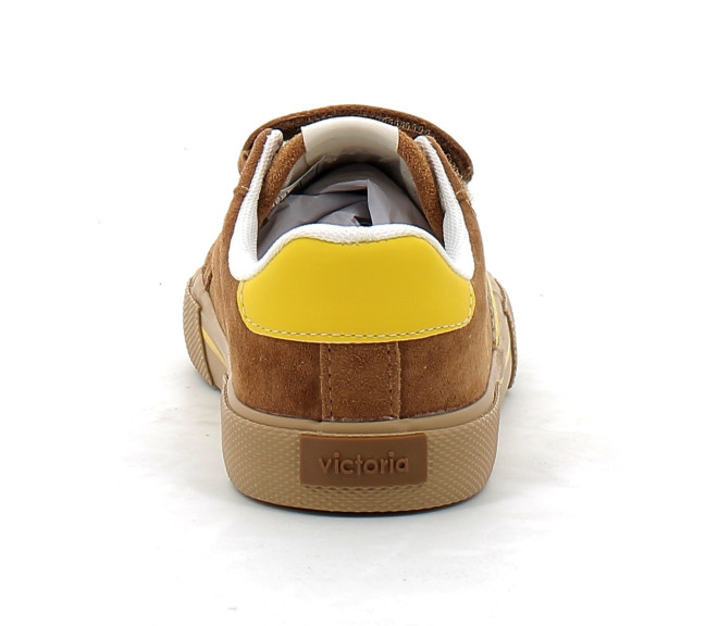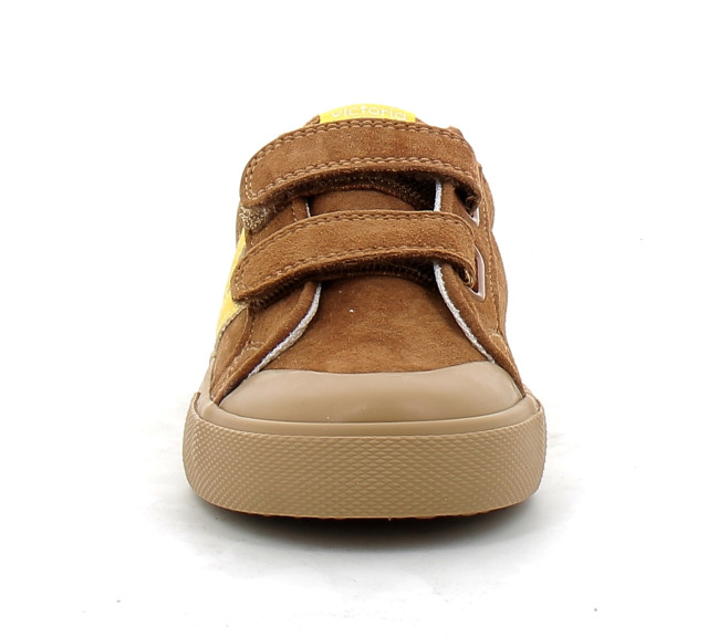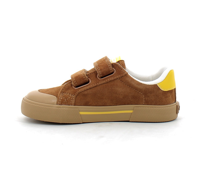 Baskets pour enfants fabriquées en croûte de cuir avec empiècements synthétiques. V latérale et pièce arrière dans des couleurs contrastées assorties. Fermeture par deux bandes auto-agrippantes pour un enfilage facile et un bon maintien. Semelle en caoutchouc couleur caramel avec renfort à l'avant pour plus de résistance et de durabilité.