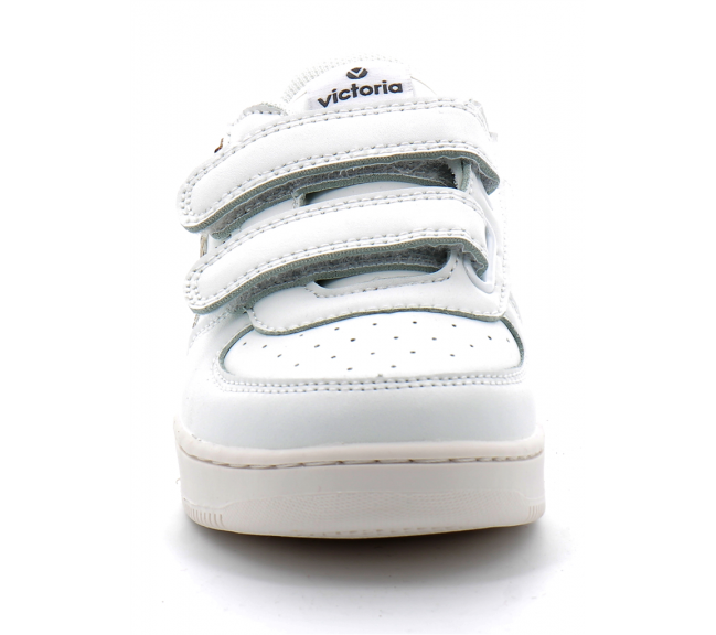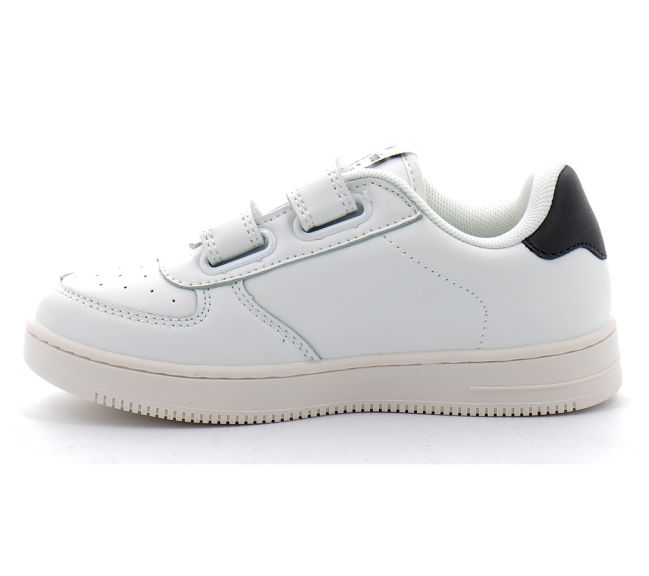 Baskets blanches pour fille fabriquées en Espagne dans une matière effet cuir. Logo texturé sur le côté et détail assorti à l'arrière. Fermeture à deux scratchs (trois à partir de la pointure 36) qui facilite le chaussage et permet un ajustement parfait. Avec empeigne perforée pour une meilleure aération.
