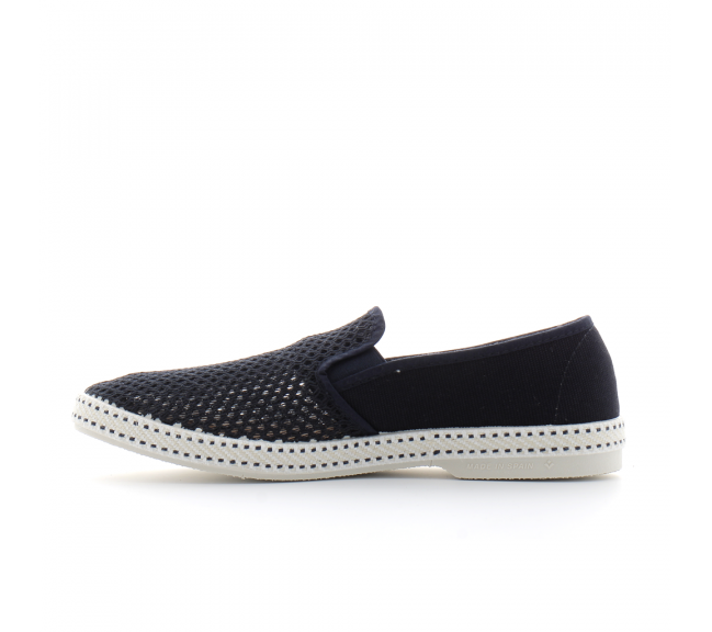 . Coton Canevas . Emblème Doré Riveté . Biais Coton . Doublure éponge . Plante intérieure cuir de mouton . Point Sellier autour de la semelle . Semelle en gomme . Fabriqué en Espagne