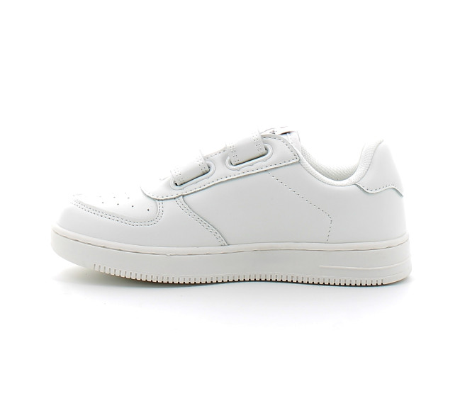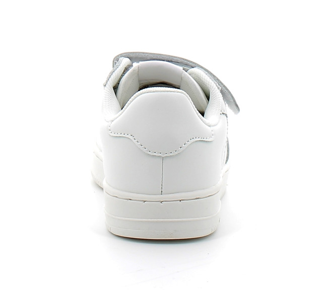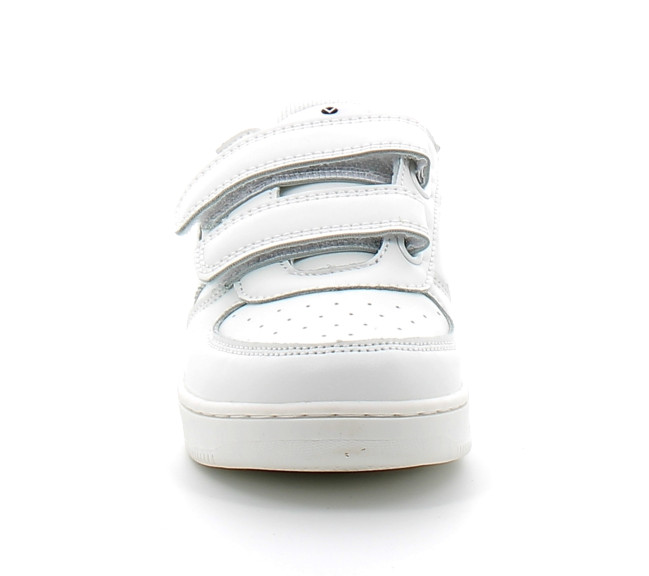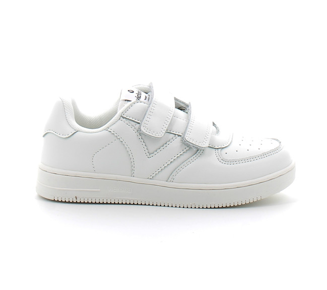 Baskets de sport blanches pour enfants fabriquées dans une matière effet cuir et V rétro de victoria sur le côté. Fermeture à deux scratchs, trois à partir de la pointure 36, qui facilite le chaussage et permet un ajustement parfait. Avec empeigne perforée pour une meilleure aération.