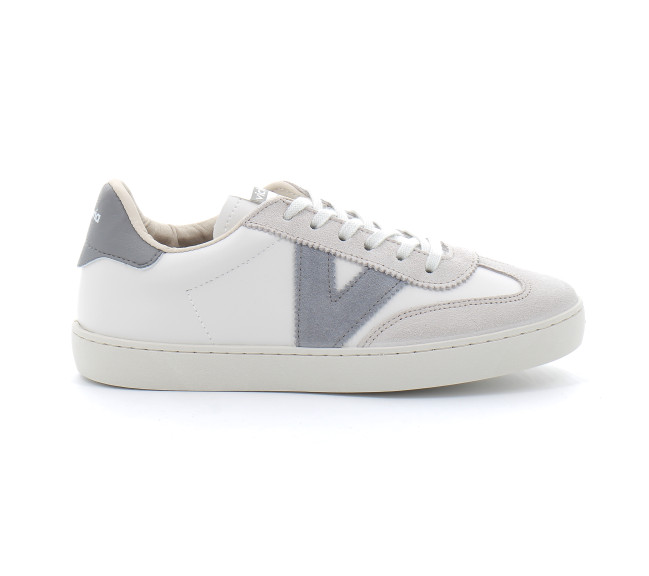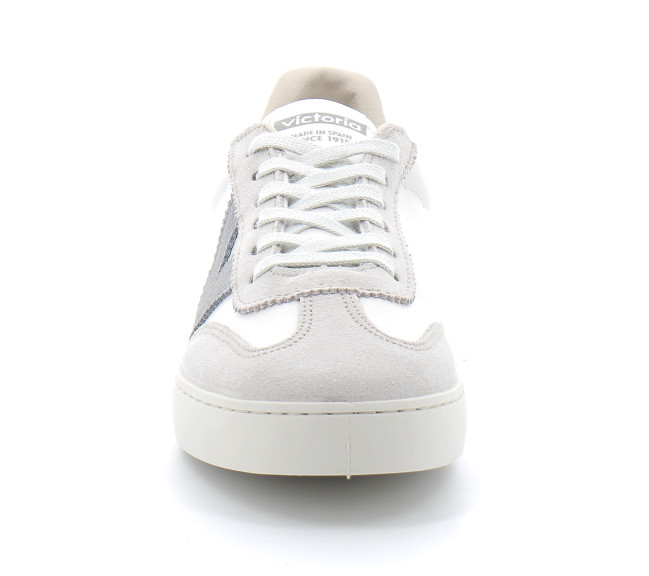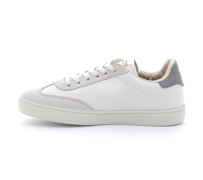 Baskets blanches fabriquées en Espagne dans une matière effet cuir et pièces en cuir fendu. Détails de couleur au niveau du V sur le côté et à l'arrière, et nouvelle coupe cycliste sur la pointe pour une touche de style supplémentaire. Semelle légèrement fauve composée d'huiles végétales plutôt que minérales, conformément à notre engagement envers l'environnement. Chaque paire de baskets dispose en outre d'une semelle intérieure plus ergonomique fabriquée à partir de matériaux recyclés.