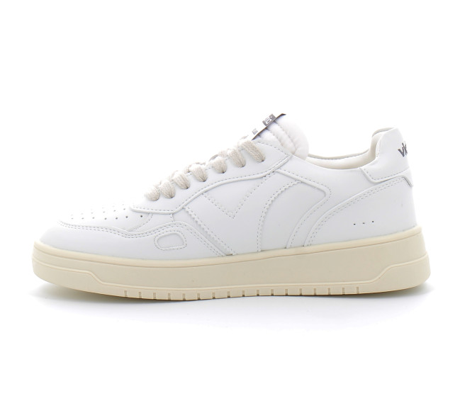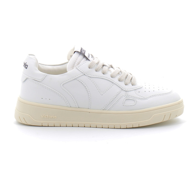 Baskets blanches pour femme fabriquées dans une matière effet cuir. V rétro et détail en forme de fenêtre sur le côté. Semelle légèrement brune de 3,5 cm et fermeture à lacets assortis. Elles disposent d'une semelle intérieure matelassée supplémentaire pour un plus grand confort.