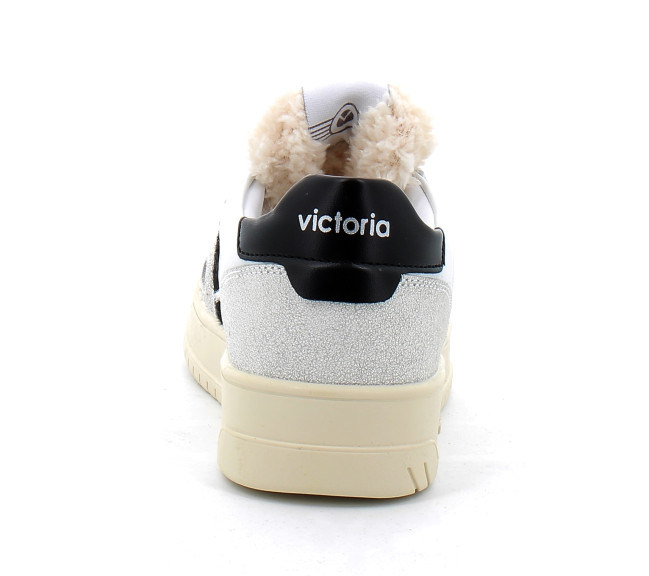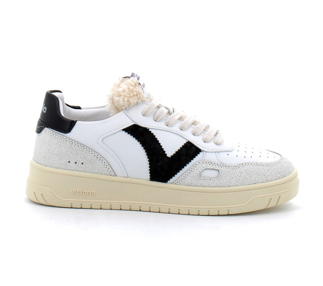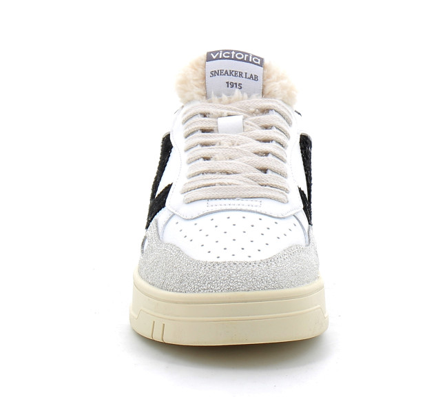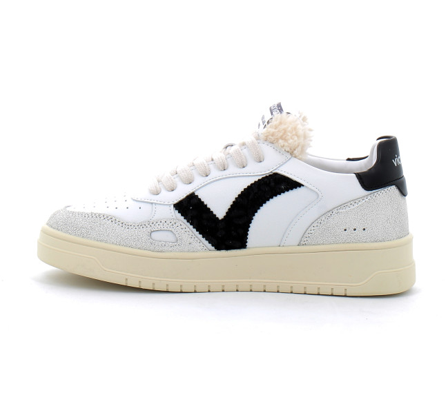 Baskets blanches pour femme et homme fabriquées dans une matière effet cuir et des pièces en cuir fendu sur la pointe, le talon et V rétro de victoria. L'étiquette de la languette et en forme de fenêtre sur le côté. Semelle légèrement brune de 3,5 cm et fermeture à lacets assortis. Elles disposent d'une semelle intérieure matelassée supplémentaire pour un plus grand confort. Languette fourrées