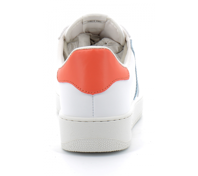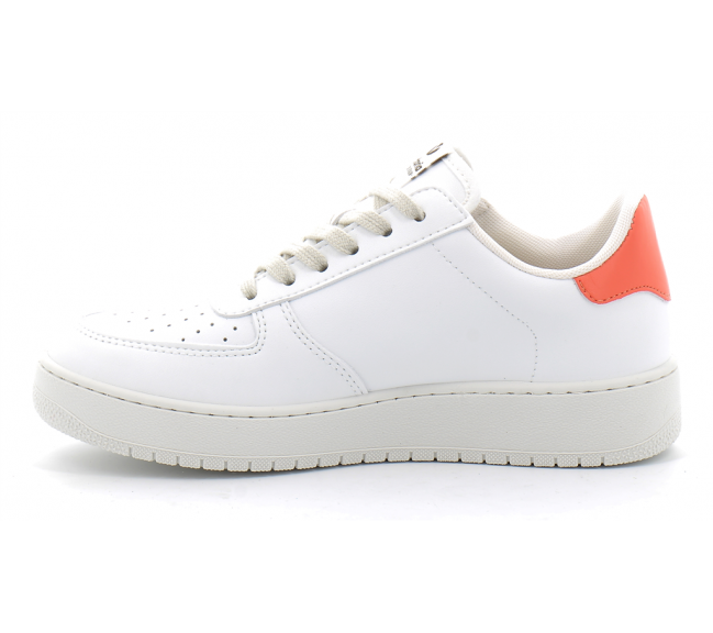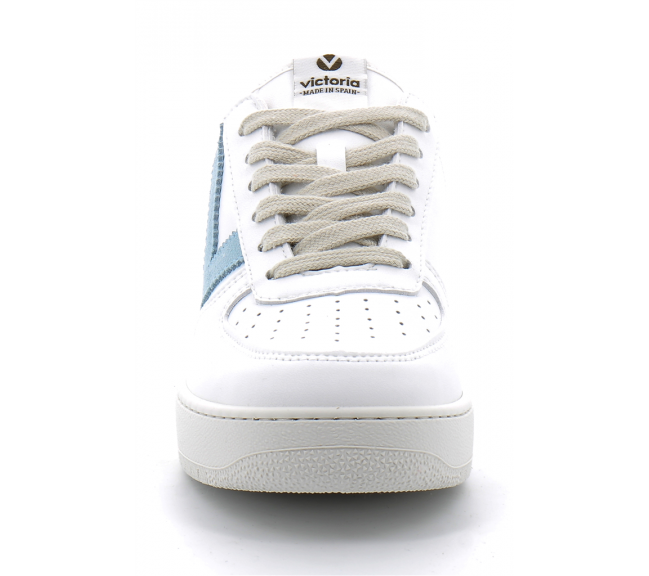 Baskets blanches pour femme fabriquées en Espagne dans une matière effet cuir et logo en cuir fendu. V de victoria sur le côté et détail sur l'arrière en noir. Fermeture à lacets et empeigne perforée pour évacuer la transpiration. Semelle de 3 cm fabriquée à partir d'huiles végétales plutôt que minérales afin de réduire l'impact sur l'environnement. Elles se distinguent par leur légèreté et leur confort.