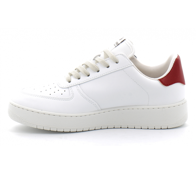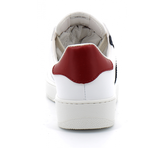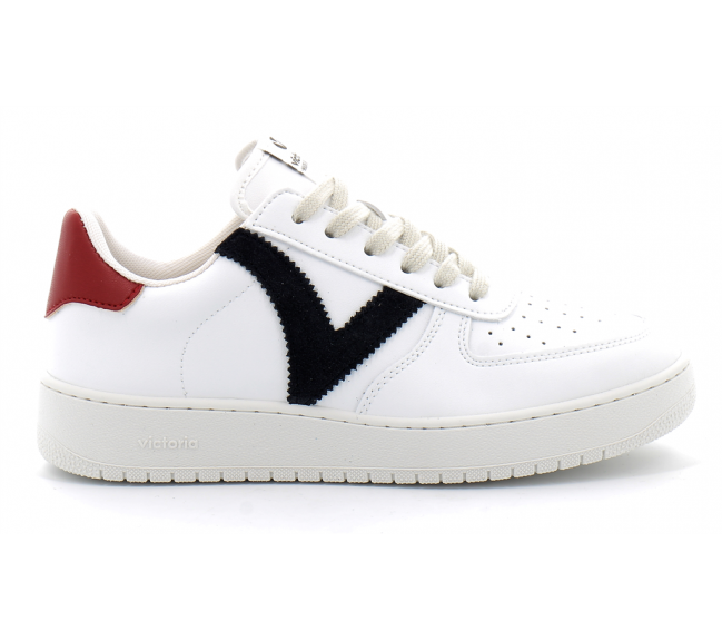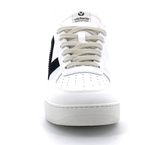 Baskets blanches pour femme fabriquées en Espagne dans une matière effet cuir et logo en cuir fendu. V de victoria sur le côté et détail sur l'arrière en noir. Fermeture à lacets et empeigne perforée pour évacuer la transpiration. Semelle de 3 cm fabriquée à partir d'huiles végétales plutôt que minérales afin de réduire l'impact sur l'environnement. Elles se distinguent par leur légèreté et leur confort.