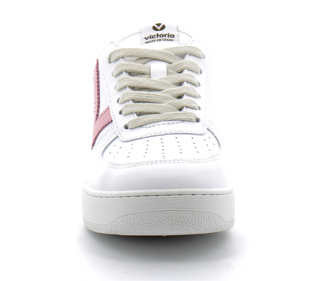 Baskets blanches pour femme fabriquées en Espagne dans une matière effet cuir et logo en cuir fendu. V de victoria sur le côté et détail sur l'arrière en noir. Fermeture à lacets et empeigne perforée pour évacuer la transpiration. Semelle de 3 cm fabriquée à partir d'huiles végétales plutôt que minérales afin de réduire l'impact sur l'environnement. Elles se distinguent par leur légèreté et leur confort.