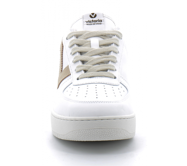 Baskets blanches pour femme fabriquées en Espagne dans une matière effet cuir et logo en cuir fendu. V de victoria sur le côté et détail sur l'arrière en noir. Fermeture à lacets et empeigne perforée pour évacuer la transpiration. Semelle de 3 cm fabriquée à partir d'huiles végétales plutôt que minérales afin de réduire l'impact sur l'environnement. Elles se distinguent par leur légèreté et leur confort.