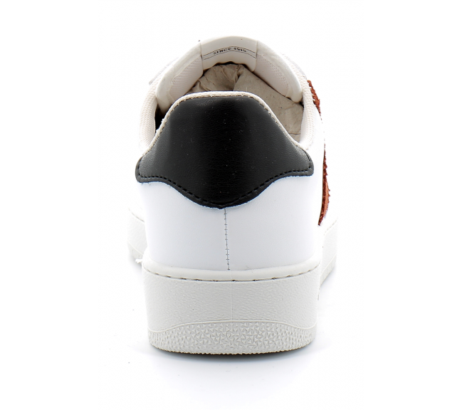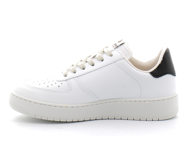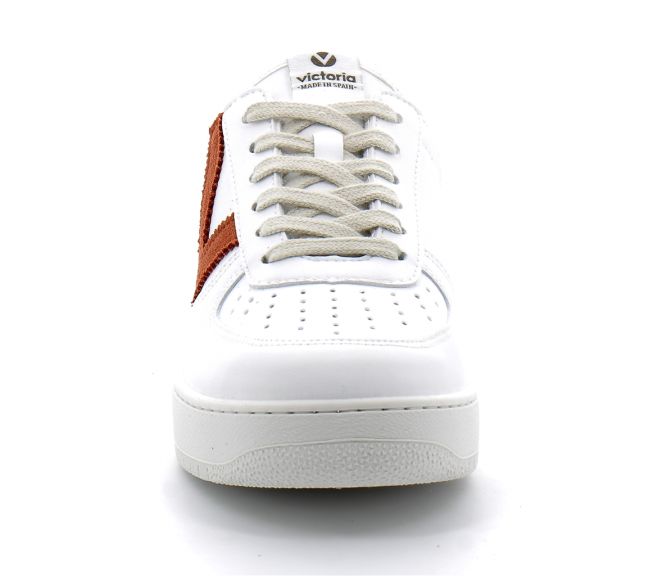 Baskets blanches pour femme fabriquées en Espagne dans une matière effet cuir et logo en cuir fendu. V de victoria sur le côté et détail sur l'arrière en noir. Fermeture à lacets et empeigne perforée pour évacuer la transpiration. Semelle de 3 cm fabriquée à partir d'huiles végétales plutôt que minérales afin de réduire l'impact sur l'environnement. Elles se distinguent par leur légèreté et leur confort.