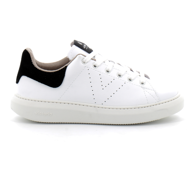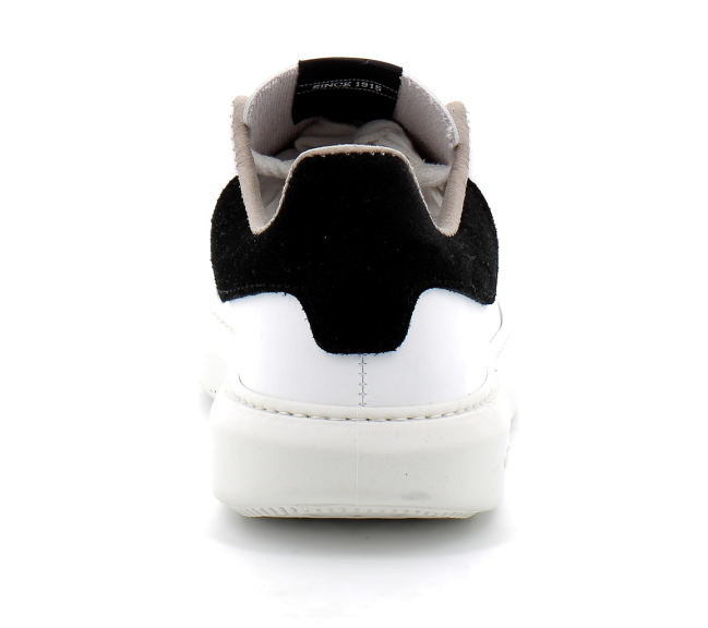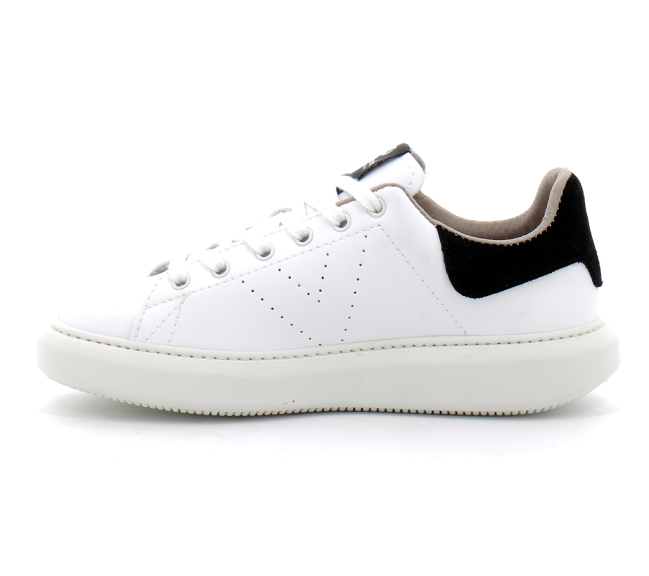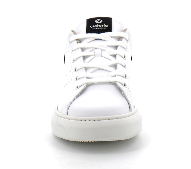 Baskets blanches pour femme fabriquées en Espagne dans une matière effet cuir. Logo perforé sur le côté et fermeture à lacets en blanc. Pièce en cuir fendu sur l'arrière assortie avec l'étiquette de la languette. Semelle arrondie volumineuse de 3 cm. Saviez-vous que leur nouvelle semelle résulte de la réutilisation d'anciens moules ? Cela permet d'économiser de l'aluminium et d'aller encore plus loin dans la démarche durable de notre projet Dear World