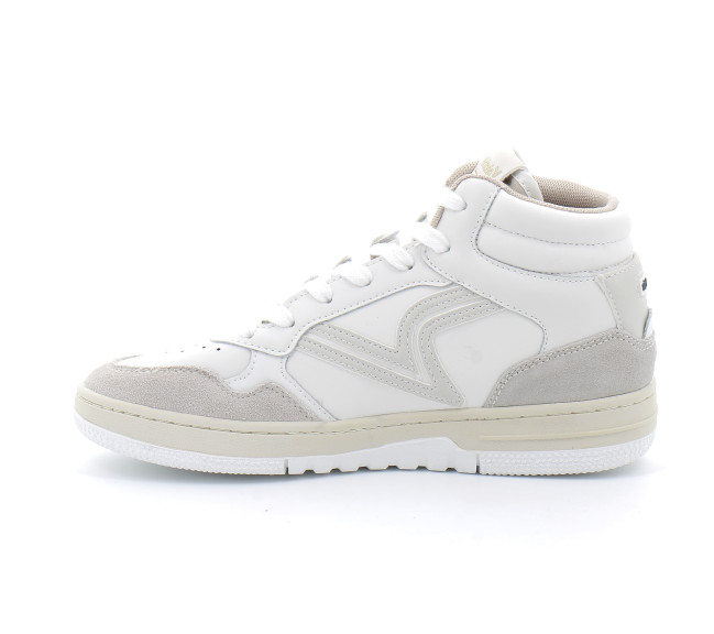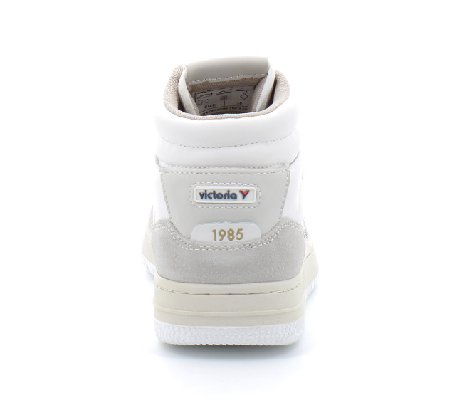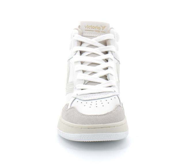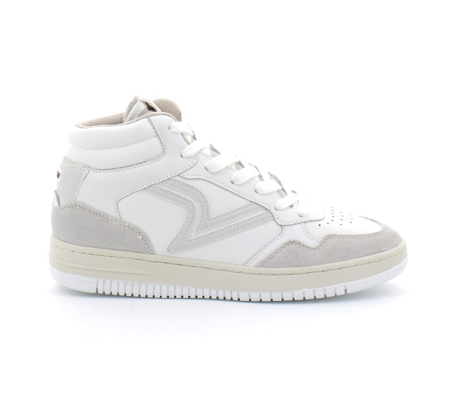 Bottines blanches pour femme et homme d'un esprit rétro fabriquées en cuir de vachette. Pièces en cuir fendu gris sur la pointe et le talon assorti au V du côté. Tige haute de 9,5 cm avec arrière matelassé et empeigne perforée pour évacuer la transpiration. Semelle brune bicolore et fermeture à lacets.