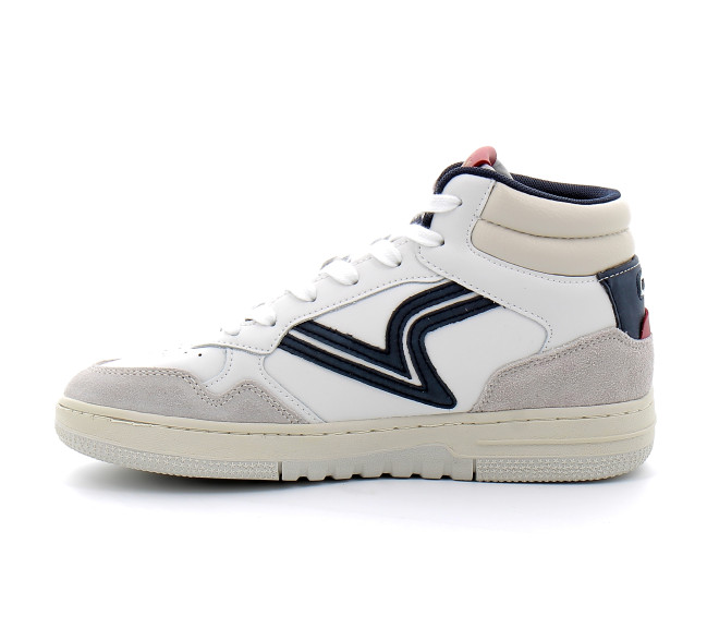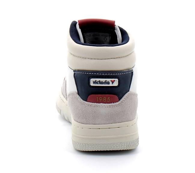 Bottines blanches pour femme et homme d'un esprit rétro fabriquées en cuir de vachette. Pièces en cuir fendu gris sur la pointe et le talon assorti au V du côté. Tige haute de 9,5 cm avec arrière matelassé et empeigne perforée pour évacuer la transpiration. Semelle brune bicolore et fermeture à lacets.