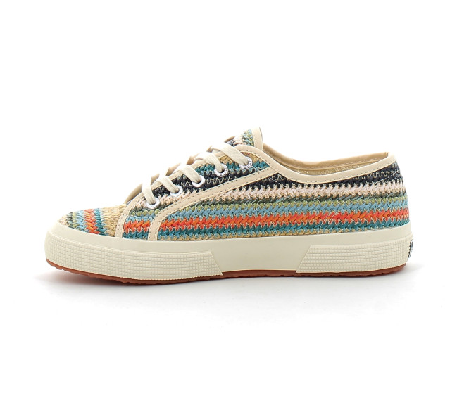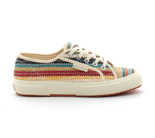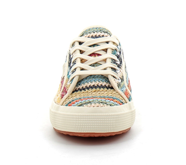 Avec leur silhouette sportive et leur touche féminine, les baskets Superga 2750, confectionnées en raphia, ne passent pas inaperçues. Elles arborent plusieurs détails emblématiques de la marque : lacets en coton, étiquette logo sur le côté et semelle vulcanisée robuste en caoutchouc naturel.