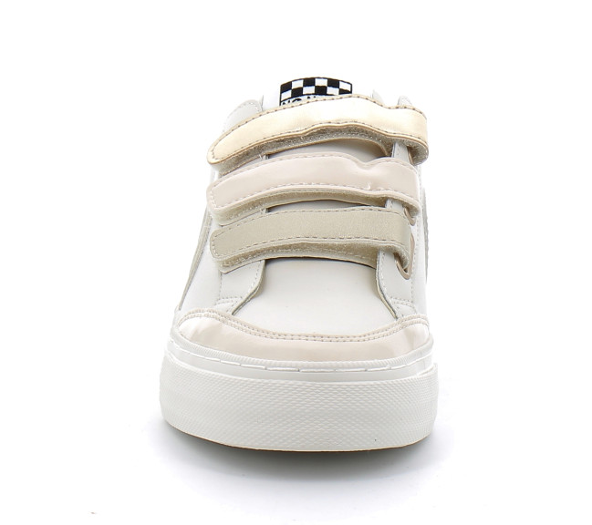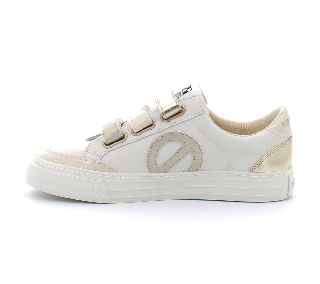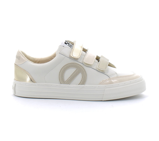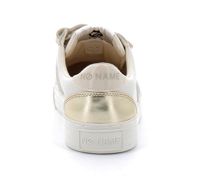 Nouvelle incontournable du vestiaire féminin, la STRIKE STRAPS se pare d’une robe écru en cuir recyclé*. Elle est subtilement rehaussée de touches métallisées et irisées dans un élégant mix de beige et de platine. Conservant sa cool attitude avec sa fermeture 3 straps, cette NO NAME, reconnaissable par sa semelle plateforme, dégage une élégance décontractée et apporte une touche d’éclat à toutes tes tenues.