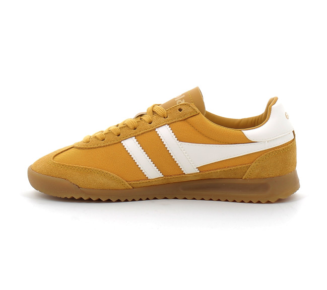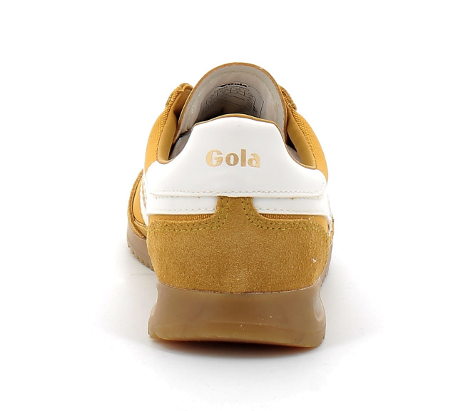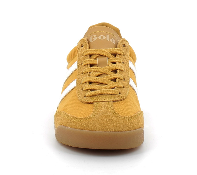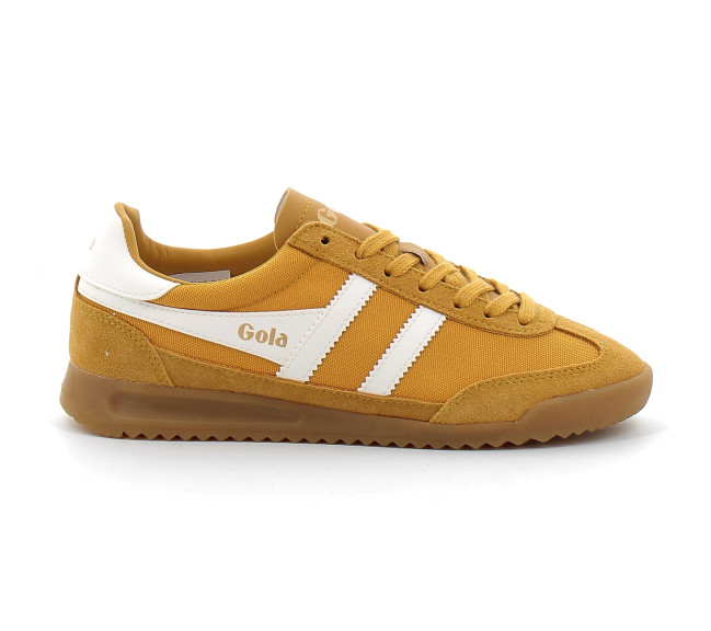 Alors que les baskets inspirées des terrasses font l'objet de nombreuses discussions, la Gola Tornado s'impose avec la rapidité que son nom suggère. Sa tige en nylon épais jaune soleil est agrémentée de finitions en daim assorties sur la pointe, le talon et la face des lacets, contrastant avec une bordure latérale Gola blanc cassé à bords en dents de scie. Posée sur une semelle compensée en gomme, la Tornado pour femme offre un look classique et authentique.