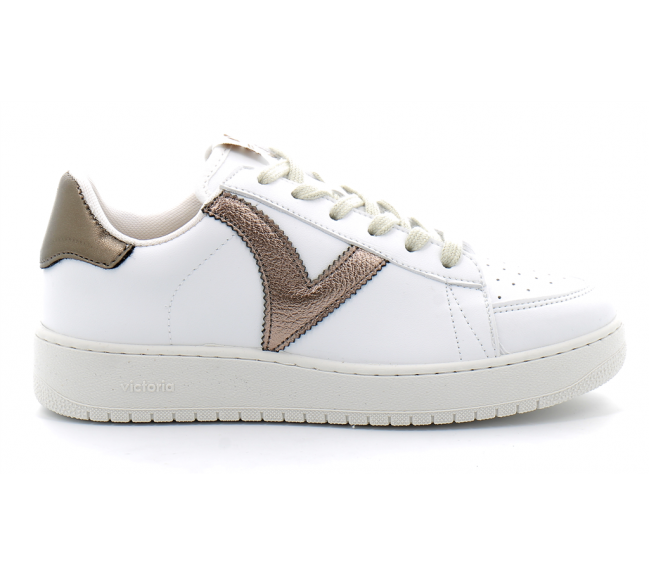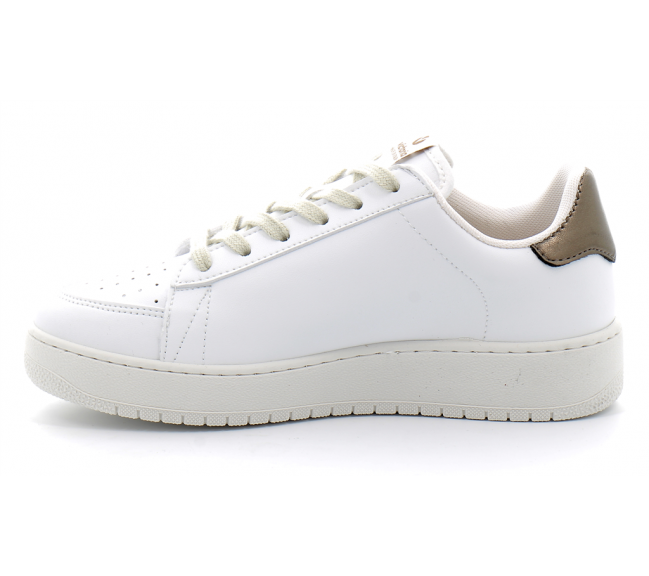 Baskets blanches pour femme fabriquées en Espagne dans une matière effet cuir. Pièces métallisées sur le V du côté et à l'arrière. Fermeture à lacets et empeigne perforée pour évacuer la transpiration. Semelle de 3 cm fabriquée à partir d'huiles végétales plutôt que minérales afin de réduire l'impact sur l'environnement. Elles se distinguent par leur légèreté et leur confort