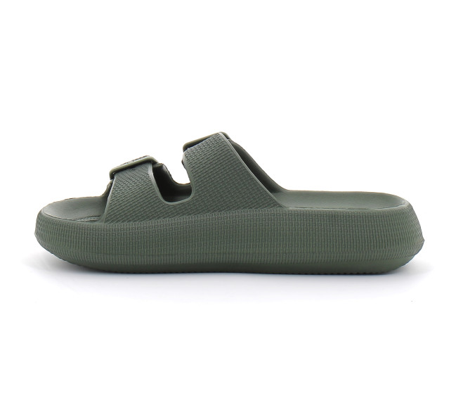Avec la nouvelle Moove Slide, Armistice insuffle une énergie nouvelle au vestiaire estival. Cette sandale noire surprend par sa conception unique en un seul bloc et sa matière innovante contenant des algues. La semelle cuvette assure un grand confort tandis que les boucles métalliques permettent un ajustement idéal des brides. Cette sandale intemporelle ajoute une touche casual aux tenues du quotidien et promet un été sans prise de tête.
